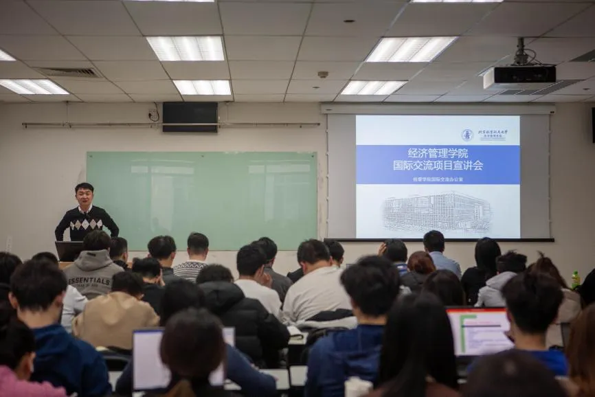 3月6日下午,经济管理学院组织开展了国际交流项目宣讲会,并邀请了国际合作部曹奇正老师及陆伯宏、蔡云帆、王元三位具有海外交换经验的学长学姐进行分享。曹奇正老师从为什么要参与海外学习、“远航计划”概述、学生交换及暑期学校项目介绍、北航学生暑期海外研习计划四个方面,结合过往北航交换学生案例,为同学们带来细致的介绍和讲解。3位参与“远航计划”学生交换项目的同学分享了参与海外学习和生活的经历。郝壮老师为同学们进一步讲解了经管学院提供的院级国际交流资源。