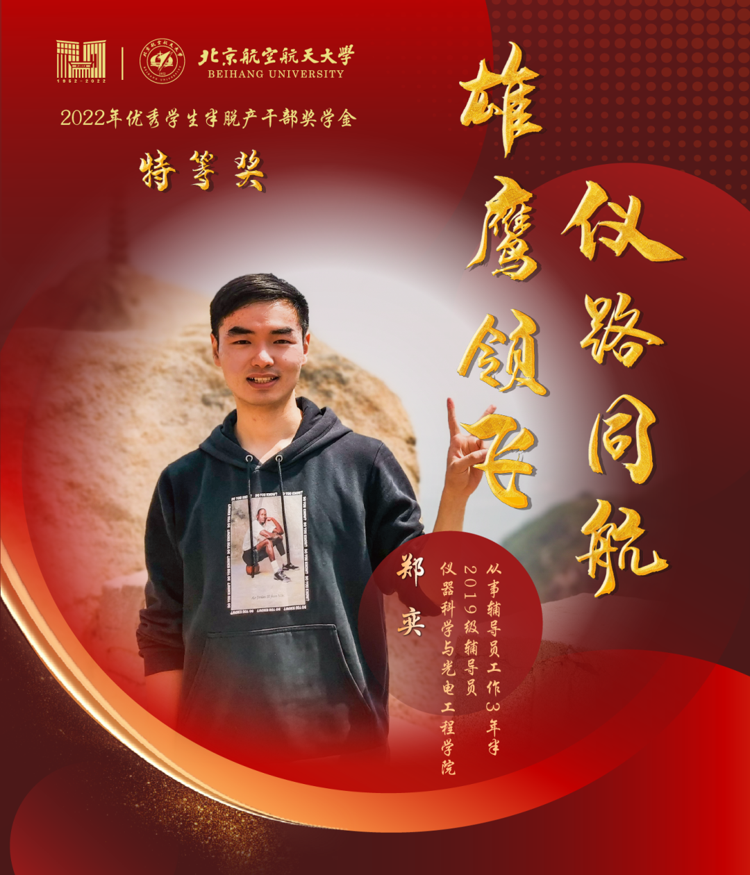 服务专项工作,五育并举多维引领。在学(书)院承担党建、科创、文体、志愿实践等多板块专项工作,担任1917本科生党支部书记,夯实学院“五位一体”科创育人模式,牵头组织北航脊梁系列《永恒》话剧升级和展演,坚持做好各项赛事服务、志愿实践组织保障,助力学院获得“冯如杯”“志愿服务工作先进单位”“文艺工作先进学院”“社会实践工作先进单位”等称号。
