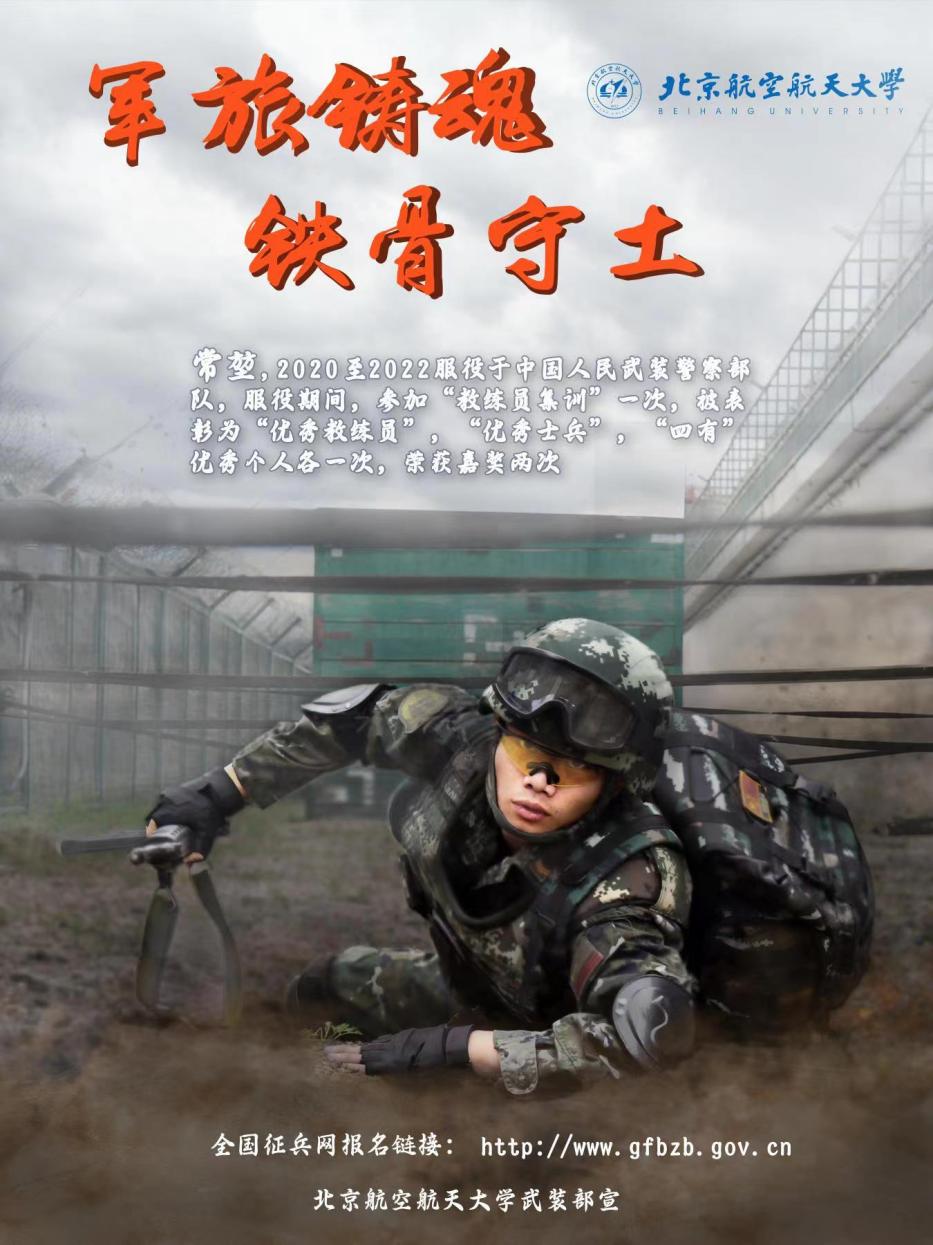 常堃,2019年考入北航致真书院,2020至2022服役于中国人民武装警察部队。服役期间,积极刻苦,勇争荣誉,各科目均达优秀水平,中队训练成绩排名第一。先后参加“教练员集训”一次,被表彰为“优秀教练员”,参加“军人运动会”,荣获团体第二名,单科目第一,荣获嘉奖两次,被评为“四有”优秀个人。