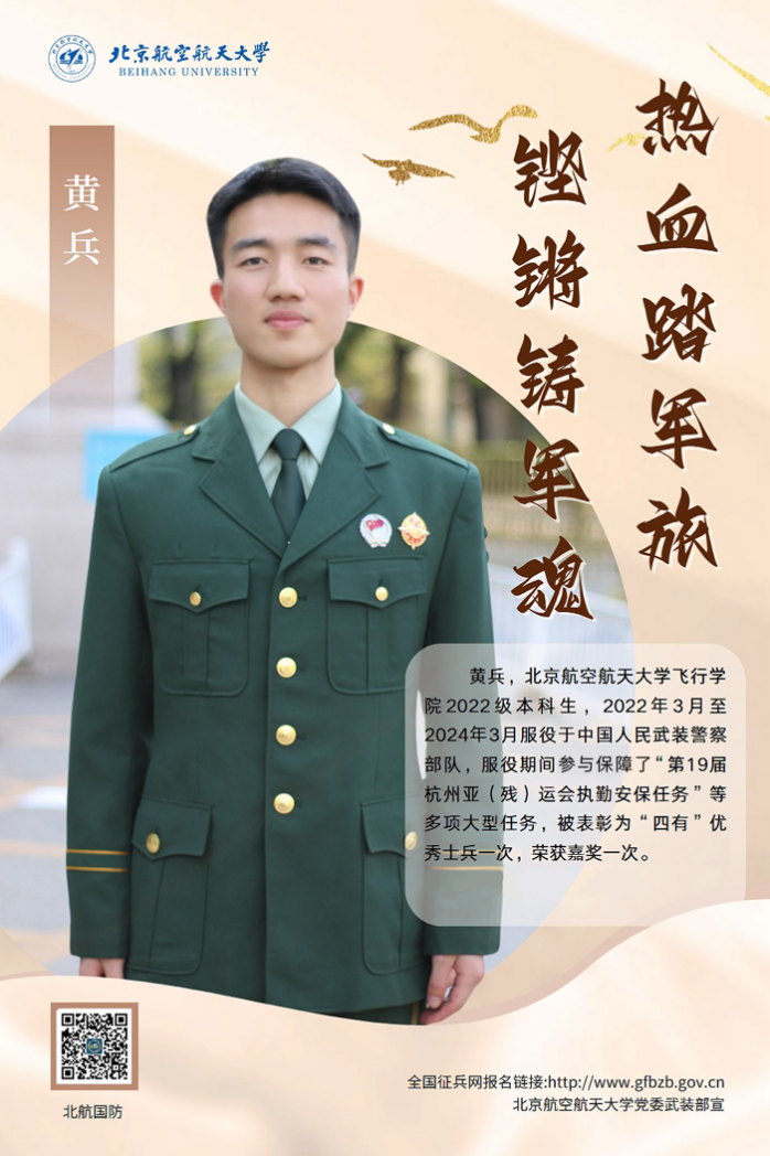 黄兵,北京伊人99飞行学院2022级本科生,2022年3月至2024年3月服役于中国人民武装警察部队,服役期间参与保障了“第19届杭州亚(残)运会执勤安保任务”等多项大型任务,被表彰为“四有”优秀士兵一次,荣获嘉奖一次。