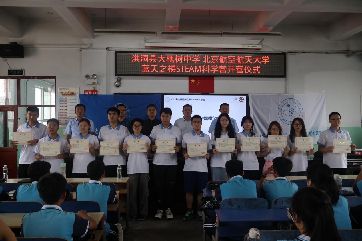 与会领导为蓝天之梯支教队的队员们颁发聘书,标志着蓝天之梯STEAM科学营正式启航。北航蓝天之梯支教队甘为人梯,拾级而上,怀揣着努力作为、勇于担当、不负时代、不负青春的热血与朝气;肩负着不忘初心、顺应时代、自我历练、自我奉献的责任与担当。