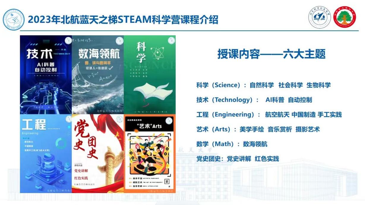 在课程设置方面,为了开阔中学生的视野、满足中学生兴趣培训的需求,蓝天之梯支教队利用专业特长与优势,在大槐树中学开展以STEAM(Science、Technology、Engineering、Arts、Math)为主题,以党史团史讲解、航空航天特色结合STEAM教育。旨在为同学们进行基础学科知识的巩固、前沿科学技术的介绍、动手实践能力的提高以及爱党爱国情怀的培养。在为期一周的科学营中,希望同学们能够丰富知识、了解先进科技,开阔视野,在同学们的心里面埋下爱家、爱党、爱国、爱科学的种子,也希望“空天报国,敢为人先”的北航精神在同学们的心里生根发芽。