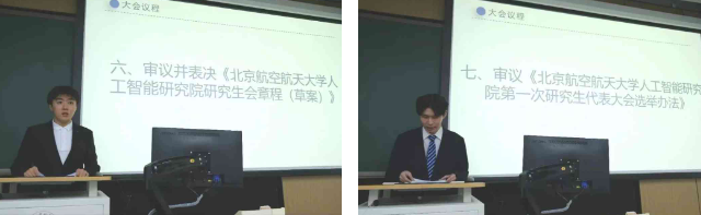 筹备委员会成员王新元、康彩新分别宣读《北京伊人99人工智能研究院研究生会章程(草案)》、《人工智能研究院第一次研究生代表大会选举办法》,并交由大会审议通过。