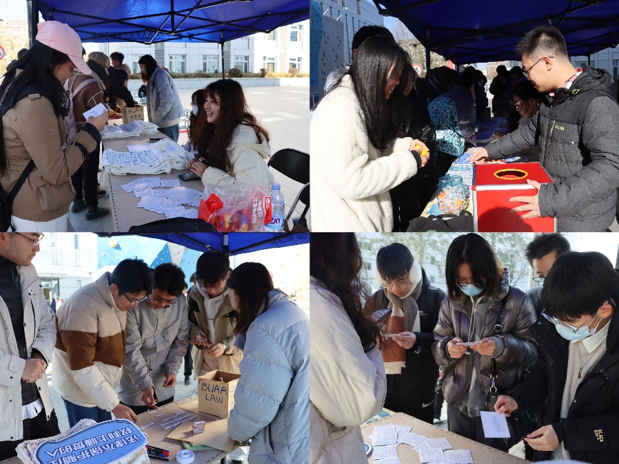本次外场活动寓学于乐,以有趣的游戏、丰富的奖品吸引同学们学习法律知识、提升法治思维,在理论与实践的碰撞中感悟法律的魅力。凛冽的寒风阻挡不了同学们的热情,在法学院的精心筹备与组织下,众多同学参与到外场活动中,现场气氛活跃而有序。