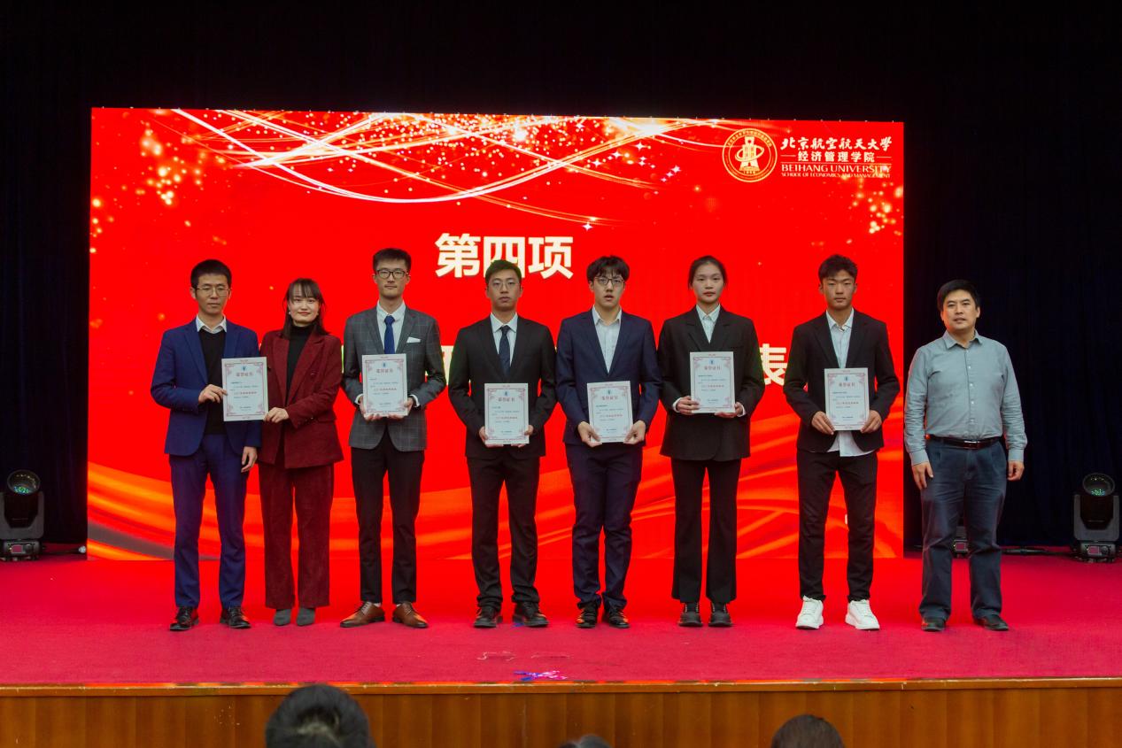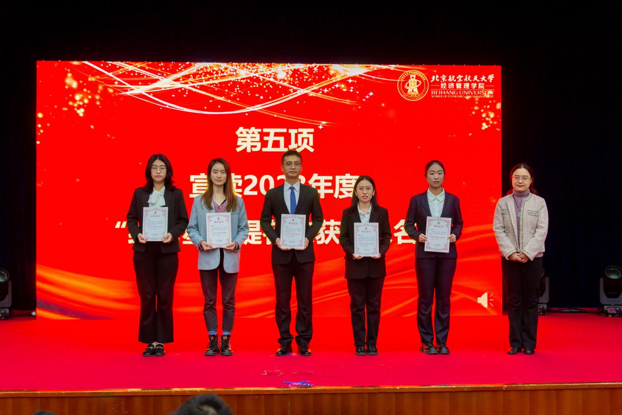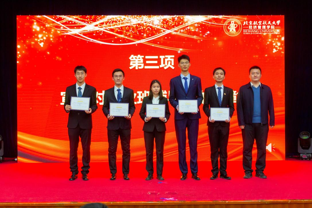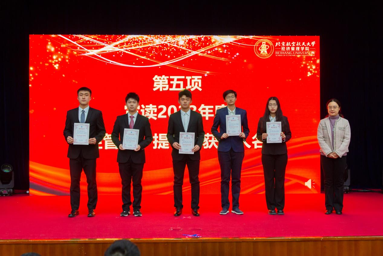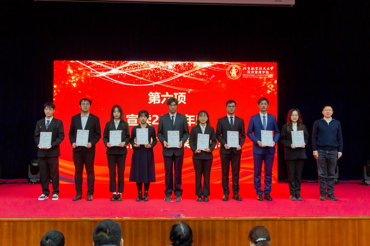 学院院长范英为经管学院年度最高荣誉“2023年度经管之星”获奖人——2020级本科生赵唯至同学颁奖。赵唯至同学大学四年专业排名第一;获挑战杯黑科技赛道特等奖,被央视采访报道;荣获北航本科生最高荣誉“沈元奖章”。