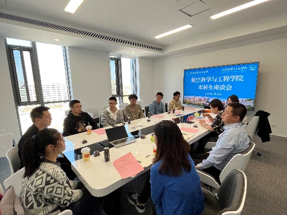 与会本科学生代表先后发言,同学们结合自己在航空学院学习生活科研的实际,分享了自己进入学院以来的感受与体会,表达了对学院以生为本、关心帮助的感谢,并围绕专业课程设置、本科班级建设、科创实践支持、后进同学学业辅导等方面提出意见建议。航空学院党委书记鲍蕊结合学校、学院政策逐一进行了耐心细致的解答。