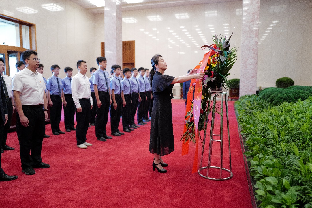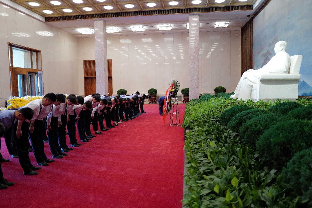 纪念堂北大厅正中是一尊汉白玉毛主席坐像,坐像背后是巨幅绒绣壁毯《祖国大地》,寓意毛泽东同志与祖国锦绣山河永远同在。飞行学院师生党员及入党积极分子肃立于毛主席的汉白玉坐像前。学院党委书记朱颖上前整理花篮缎带,全体师生向毛主席坐像鞠躬致礼,向毛主席表达崇高致意和深深缅怀之情。在瞻仰厅,全体师生党员列队缓步前行,瞻仰毛主席遗容,寄托无限的哀思。
