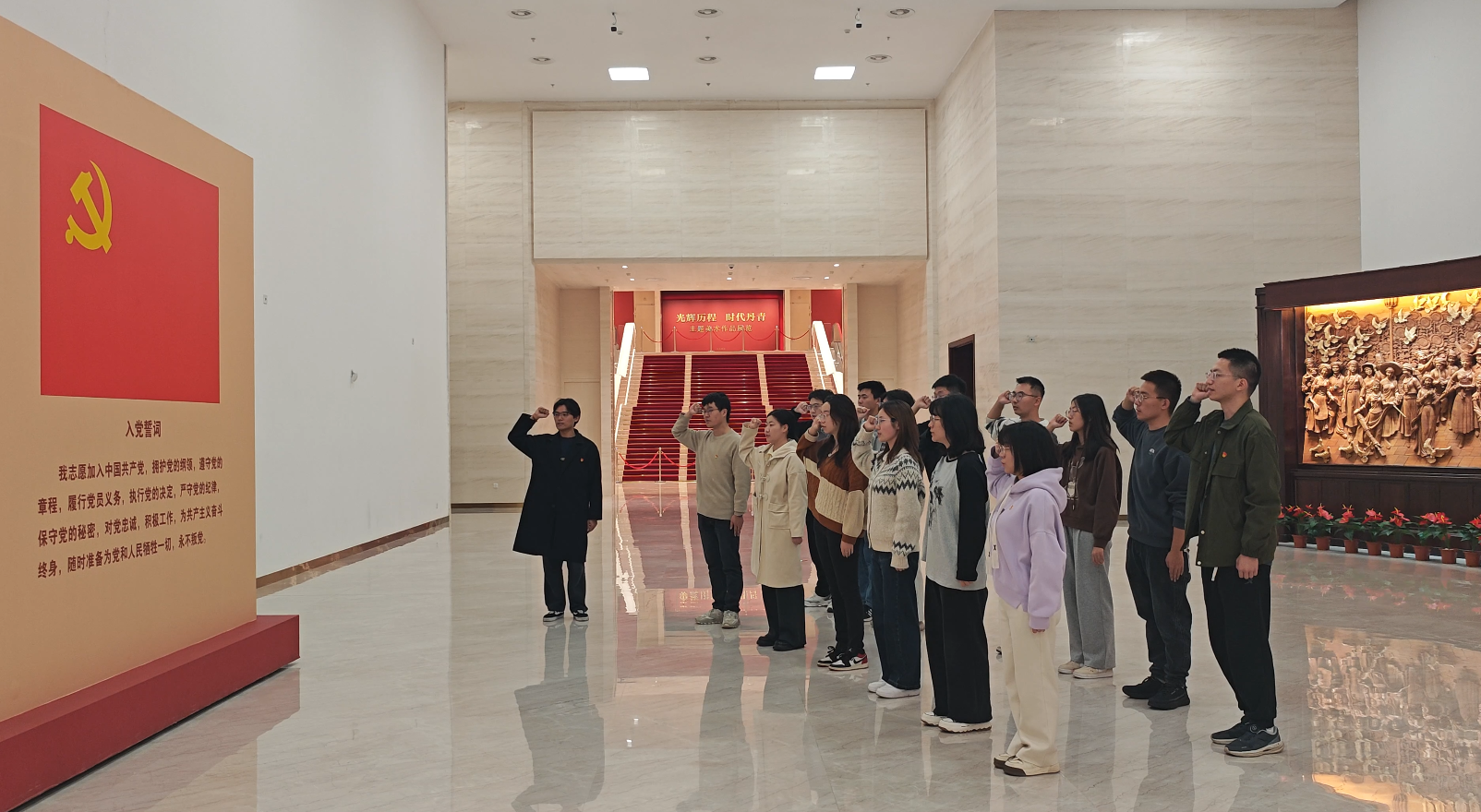参观结束后,新发展党员代表与学生骨干培训班中的党员代表进行了集中入党宣誓和党员重温入党誓词活动,通过这样生动的党性教育,使同志们时刻铭记作为一名共产党员的责任与使命,从而更加自觉地将个人理想融入党和国家的事业之中。